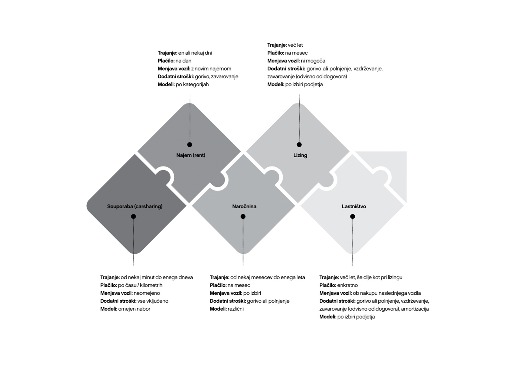 Dobro je vedeti, kakšne možnosti so vam na voljo. Vse pogosteje se v podjetjih izkaže, da se najbolje obnese hibridni model, po katerem imate del vozil v lasti ali dolgoročnejšem najemu (lizingu), druge potrebe pa potem pokrivate z naročnino, najemom ali souporabo.«