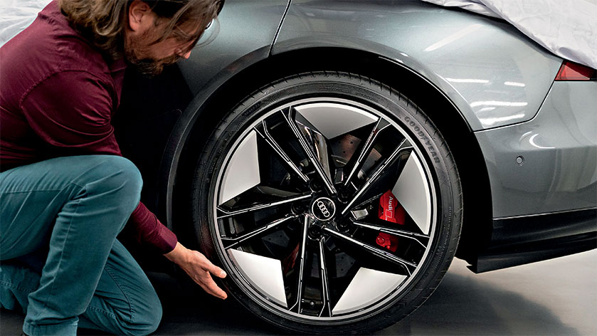 Popolna ubranost karoserije, pnevmatik in platišč, pomemben pa je tudi položaj platišča v kolesnem ohišju. Za popolno aerodinamiko moramo doseči tudi določeno ploskost površine, da lahko zrak okrog vozila potuje brez ustvarjanja močnih turbulenc. Paradoks je v tem, da ustvarjanje ploske površine platišča zahteva precej dela. Zaprta površina pomeni večjo porabo materiala, v primeru aluminija pa tudi večjo težo. Zato smo pri Audi e-tronu GT quattro za zapiranje površine platišča uporabili plastiko in mu tako zmanjšali težo.
